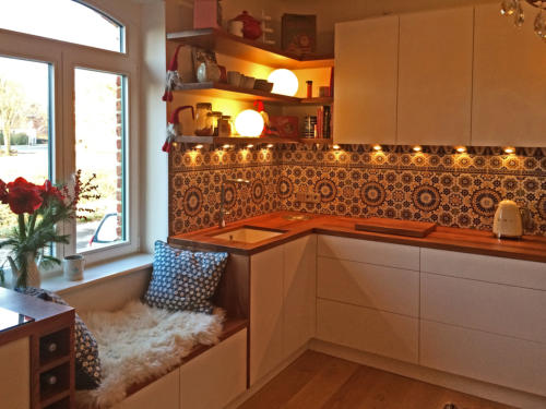 Spritzschutz und Fliesenspiegel in der Küche.